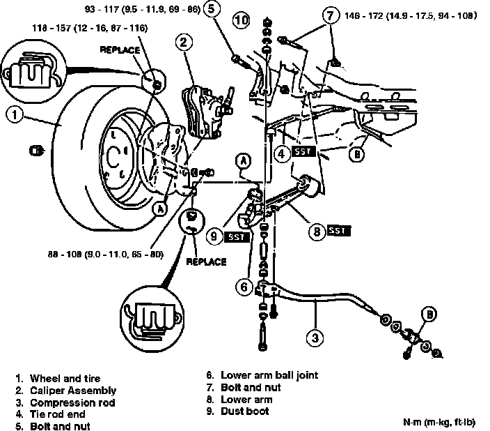 6. Remove lower control arm attaching bolt and nut, then remove the arm with the dust boot.