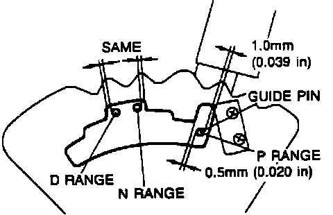 8. Move selector lever to N and D ranges, verify there is same clearance between guide plate and guide pin Fig. 7.