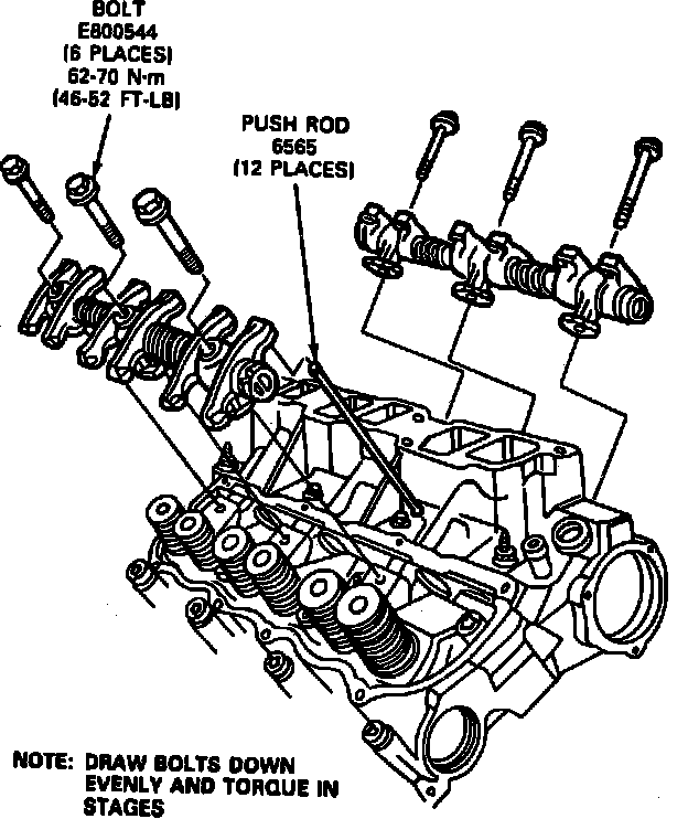8. Loosen rocker arm shaft attaching bolts in sequence two turns at a time, then remove rocker arm and shaft assembly, Fig. 4.
