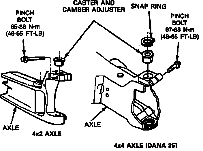 4. On 4WD models equipped with Dana 35 front drive axle, remove caster/camber adjuster snap ring.