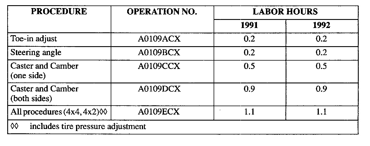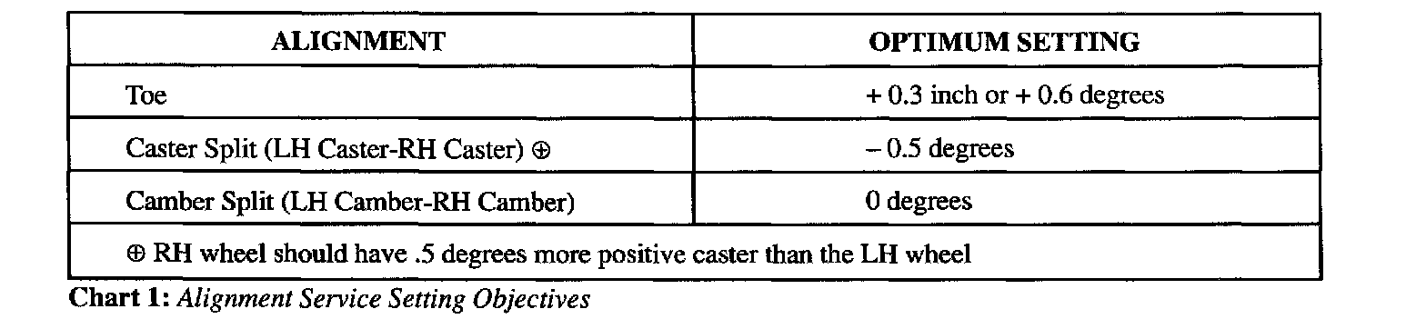 This bulletin provides optimum alignment settings for use when normal setting ranges do not correct a drift problem on Navajo vehicles. Chart 1.