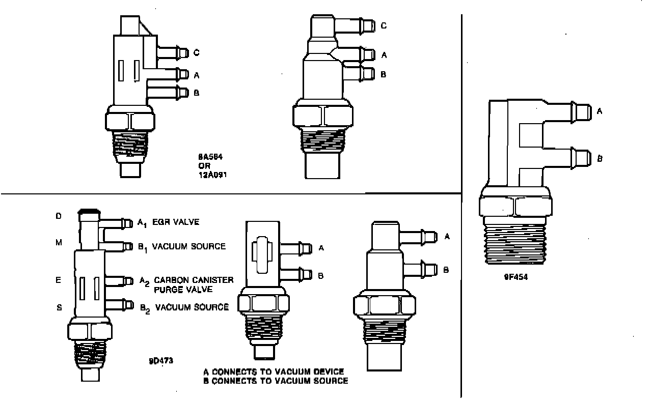 Vacuum Control Valves are designed to operate according to engine coolant temperature and are usually threaded into the engine block or manifold.Based on the wax pellet sensing bulb principle and theory, the Vacuum Control Valve directs and supplies vacuum to other emission control components. The Bimetal principle is used with the 2-port (9F454) VCV.