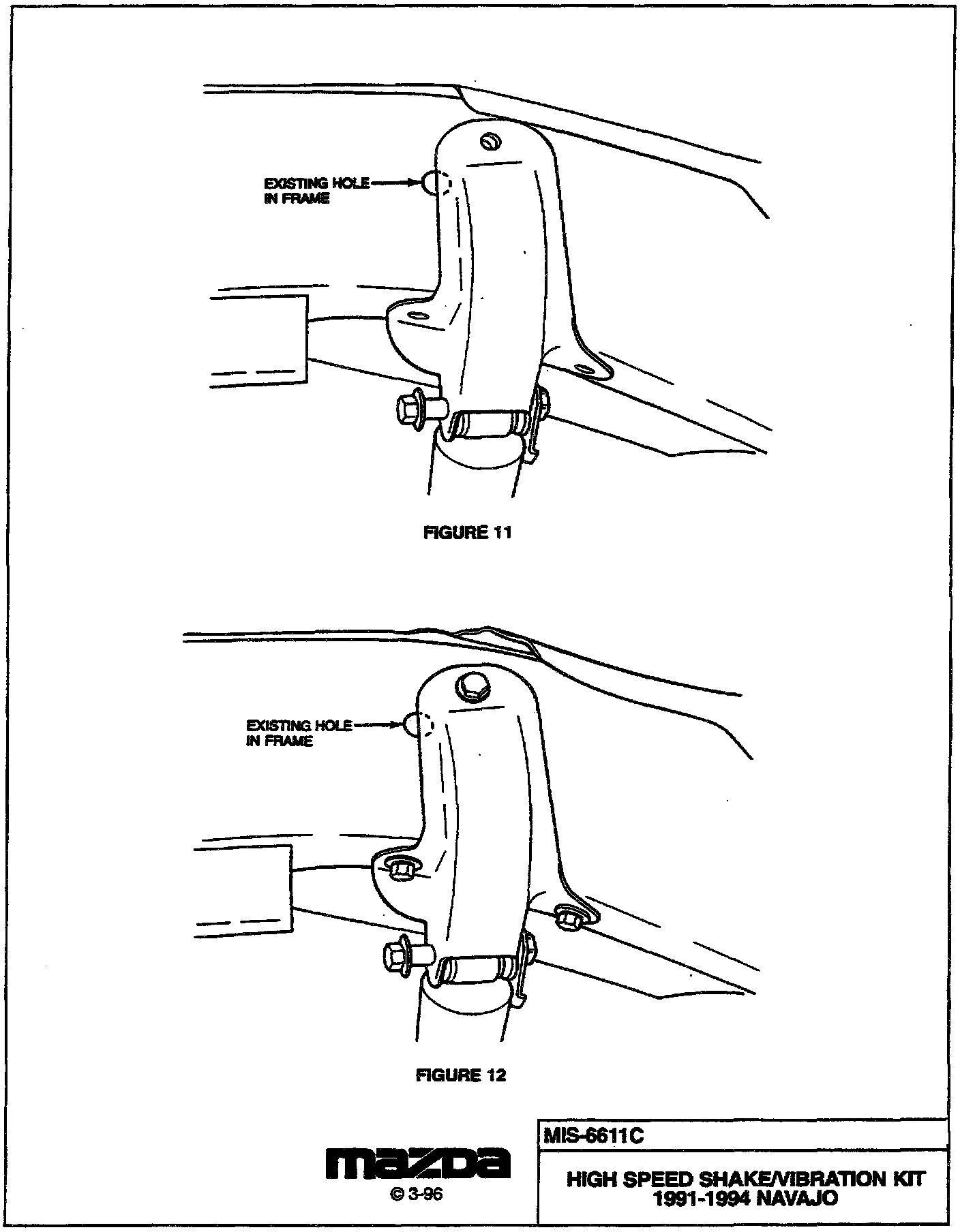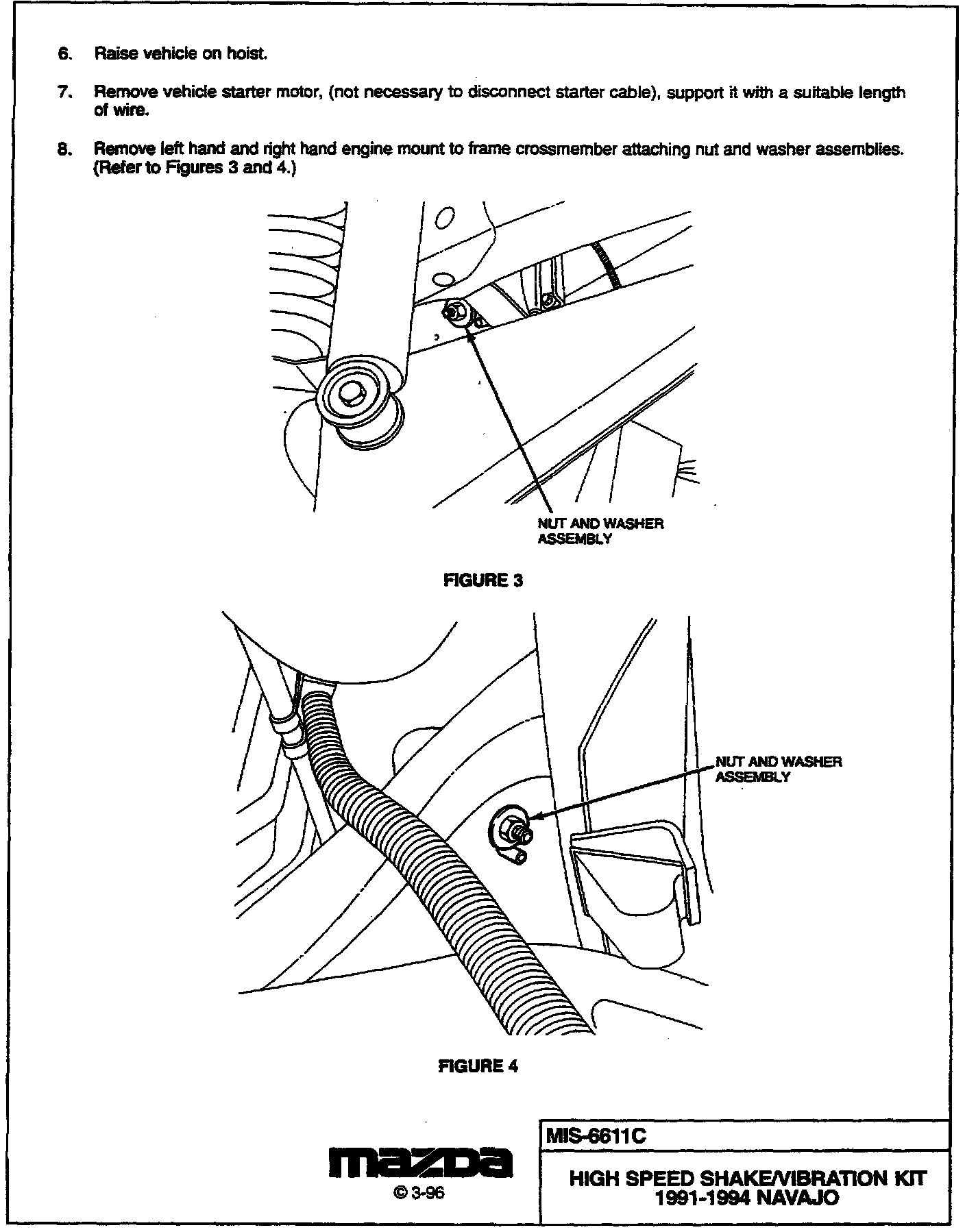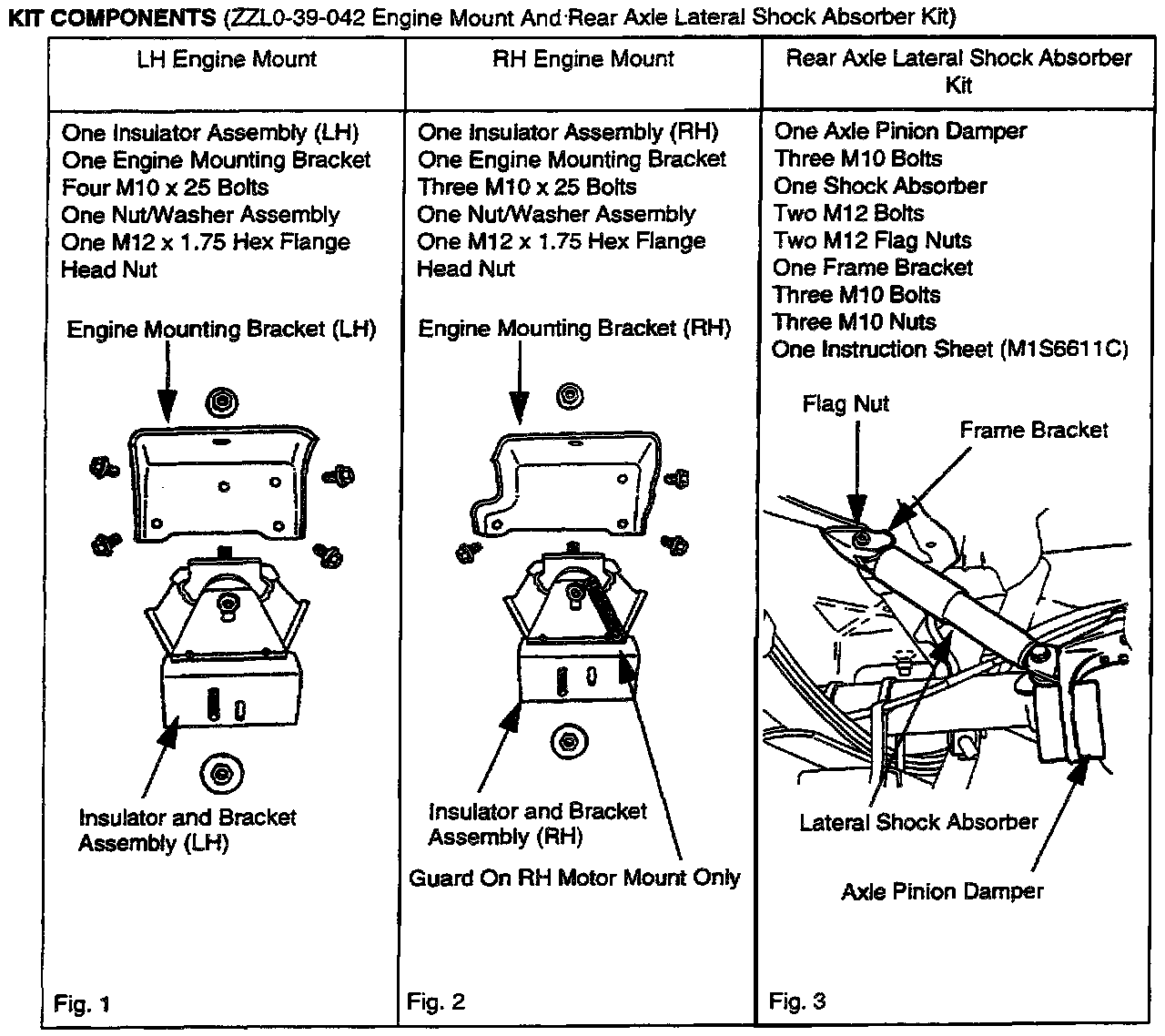 ^ If the vibration/shake still exists, install the revised engine mounts and rear axle-to-frame lateral shock absorber kit. Refer to Fig. 1, 2, and 3. Installation instructions are shown.