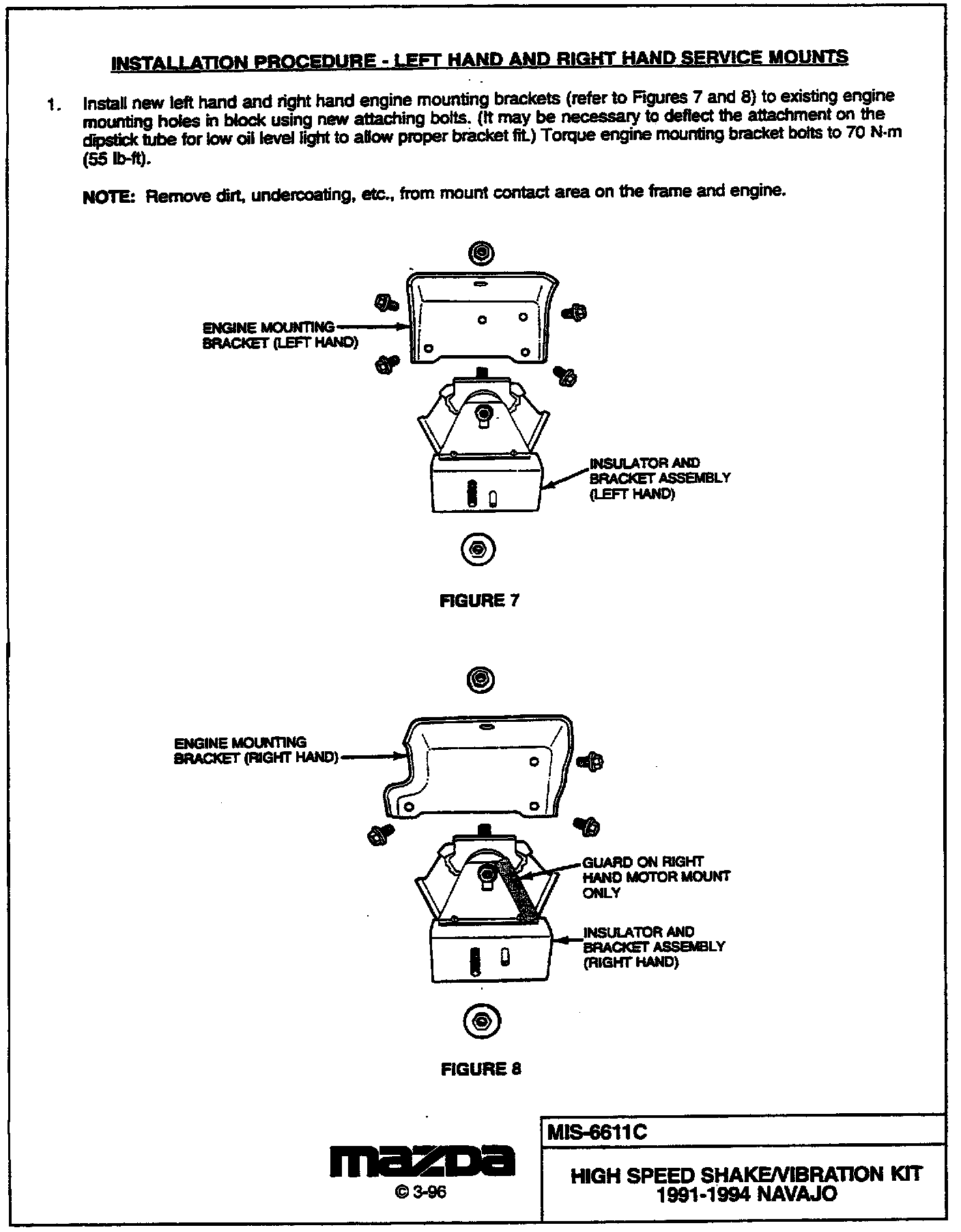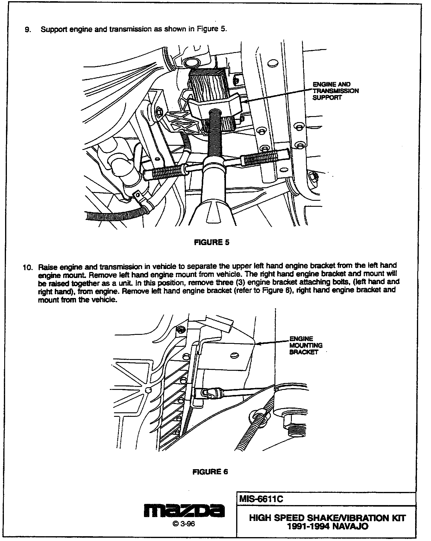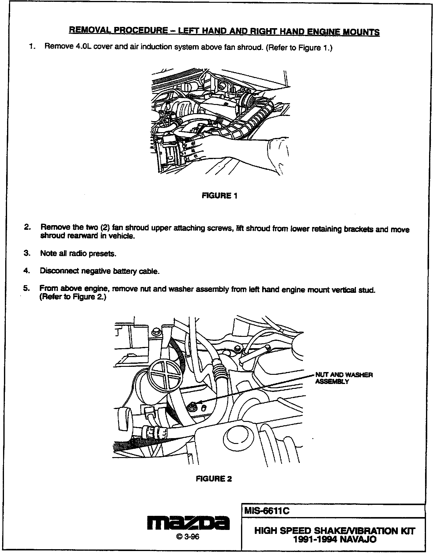 ^ If the vibration/shake still exists, install the revised engine mounts and rear axle-to-frame lateral shock absorber kit. Refer to Fig. 1, 2, and 3. Installation instructions are shown.