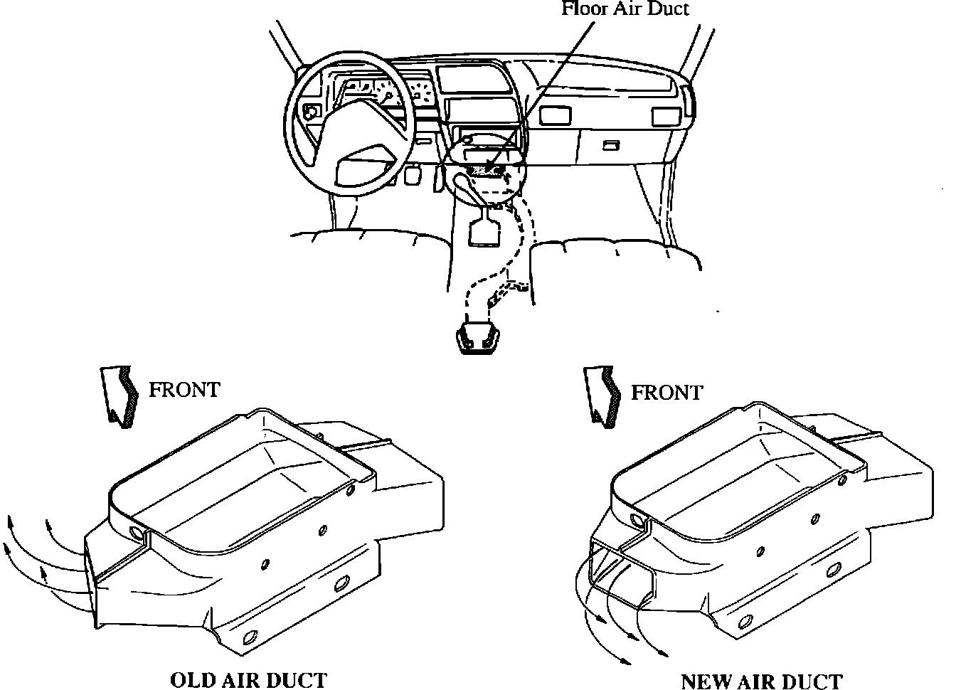 The floor air duct is angled towards the firewall and away from the driver. As a result, air is not directed to the floor area. A modified floor air duct has been established to provide better flow and adequate heating to the driver's side floor.