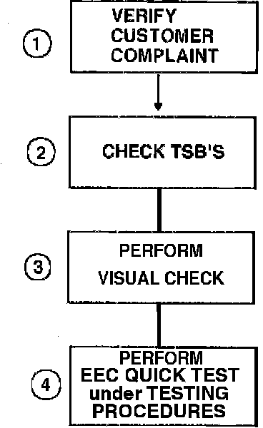 4. The On-Board Diagnostics (EEC Quick Test under TESTING PROCEDURES) will verify that ECU sensors and circuits are functioning properly or display any trouble codes that may be stored in computer memory. The EEC Quick Test is the first step in diagnosing computerized engine control problems and directs the technician to appropriate EEC Pinpoint Test Procedures under DIAGNOSTIC CHARTS.