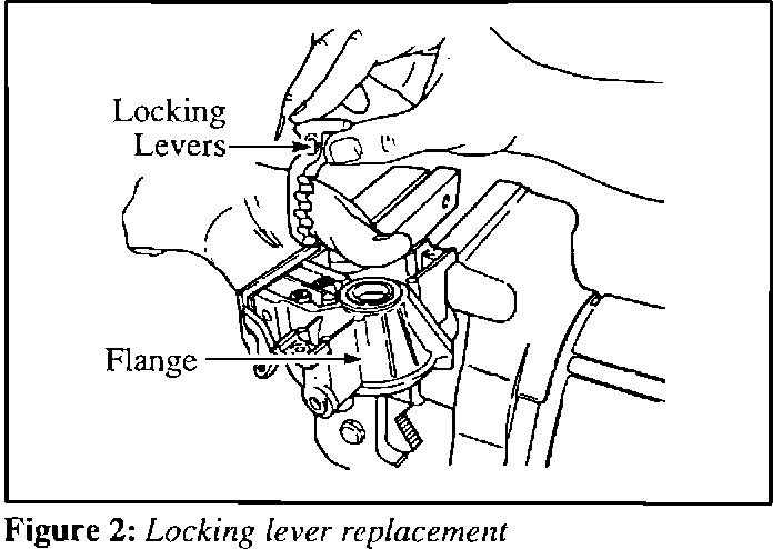 2. Next, replace the two lock levers (ZZLO 32 666 - right and ZZLO 32 656 - left) - with a single lock lever (ZZL1 32 666). Install the new lever in the location that the right hand lever was removed ftom. Figure 2.