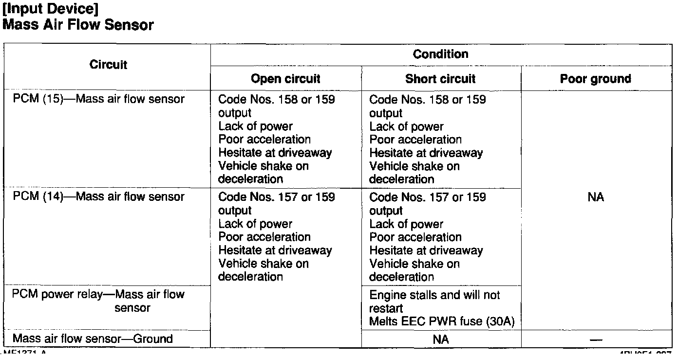 - If the mass air flow sensor or circuit has an open or short, Diagnostic Trouble Code No. 129,157, 158 or 159 is output.