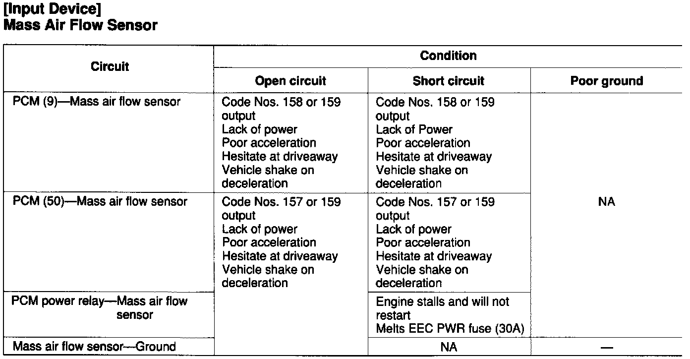 - If the mass air flow sensor or circuit has an open or short, Diagnostic Trouble Code No. 129,157, 158 or 159 is output.