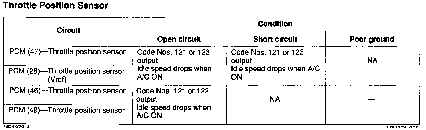 - If the throttle position sensor or circuit has an open or short, Diagnostic Trouble Code No. 121,122,123 or 167 is output.