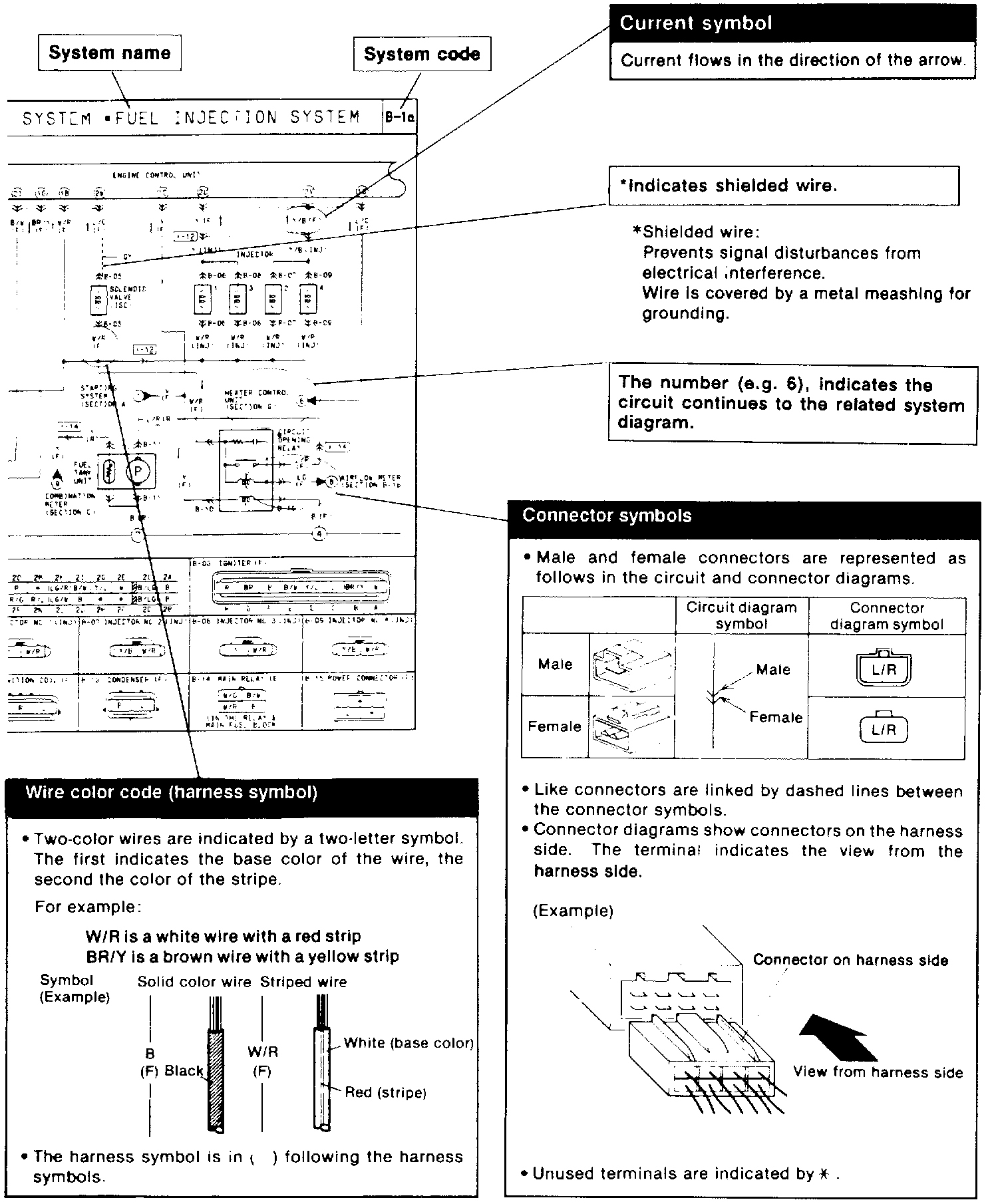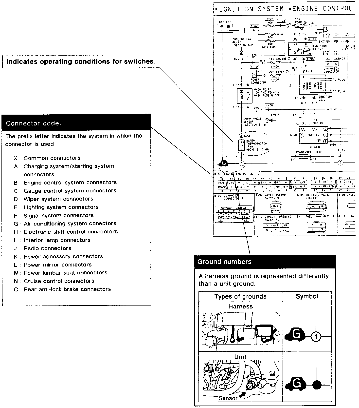These show the circuits for each system, from the power supply to the ground. The power supply side is on the upper part of the page, the ground side on the lower part. The diagrams describe circuits with the ignition switch off.