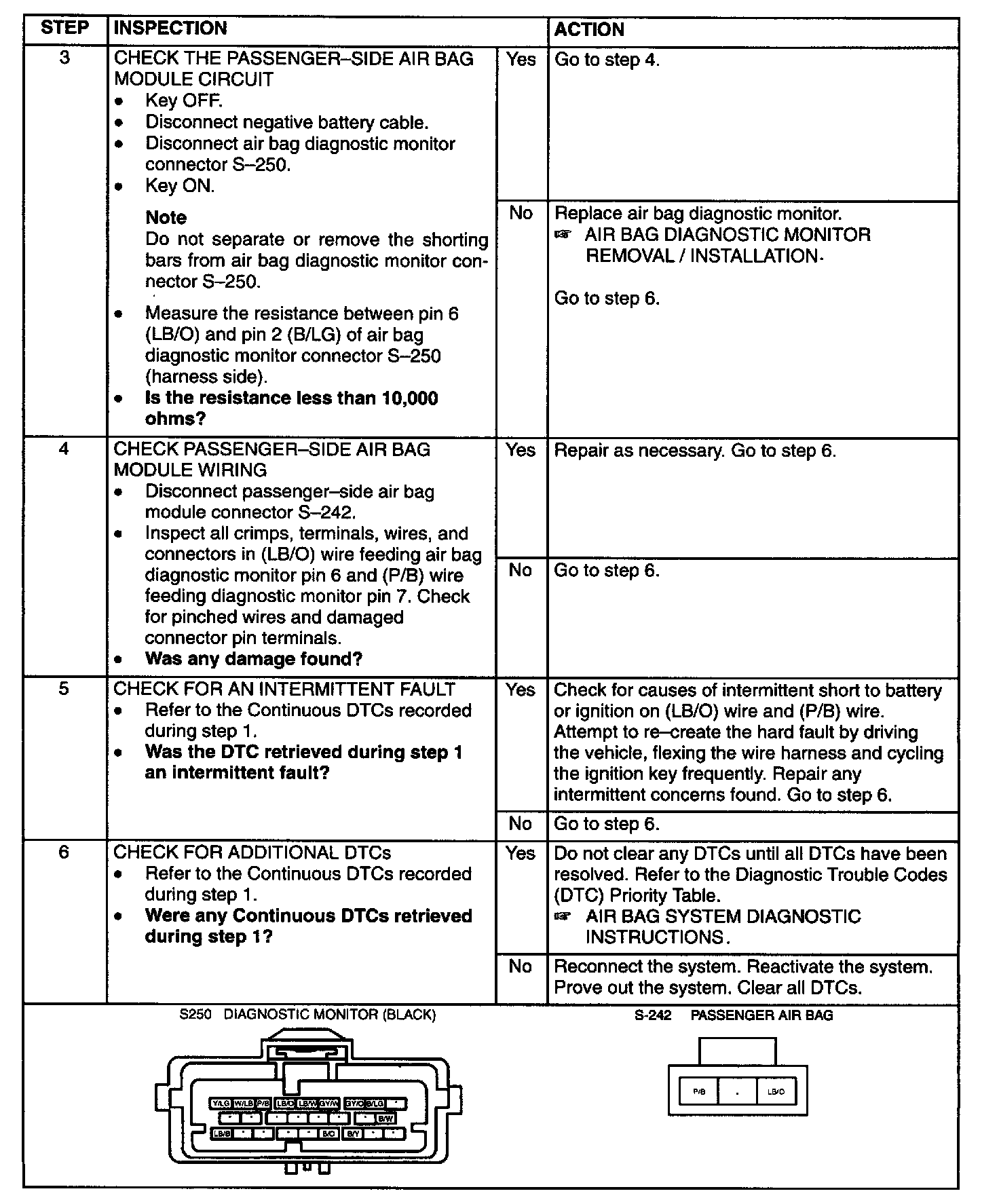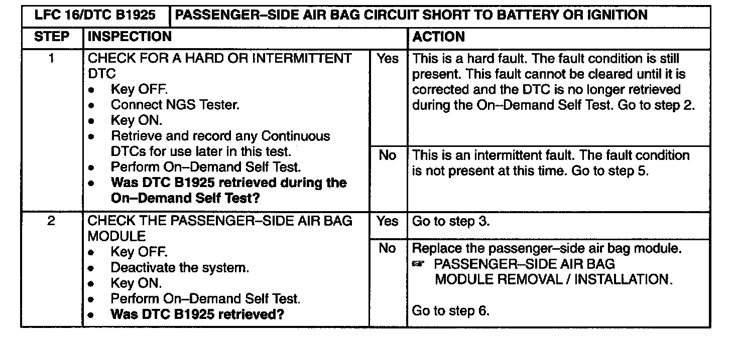 The air bag diagnostic monitor checks for passenger- side air bag circuit shorts to battery or ignition by monitoring the voltage of the (LB/O) wire and (P/B) wire at pins 6 and 7. If the diagnostic monitor detects a short to battery or ignition on either of these pins, it will store a diagnostic trouble code (DTC) B1925 in memory and flash a lamp fault code (LFC) 16 (or higher priority code if one exists) on the air bag indicator.