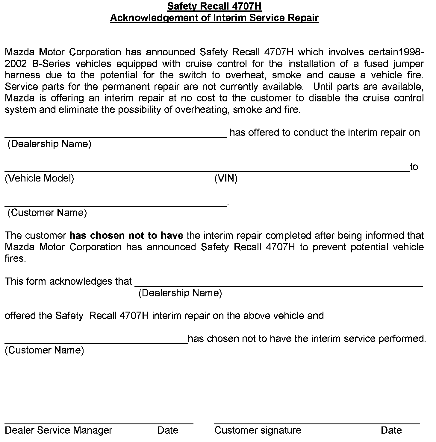 3. If the customer chooses not to have the interim repair performed, the "Acknowledgement of Interim Service Repair form shown must be completed by the dealer and signed by the customer.