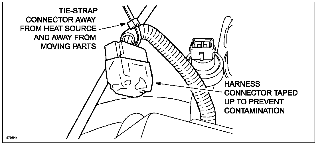 3. Secure the connector to the speed control cable or another available location using a tie-strap to prevent rattling or contact with other components. Keep the harness away from the power distribution box to avoid chafing the harness.