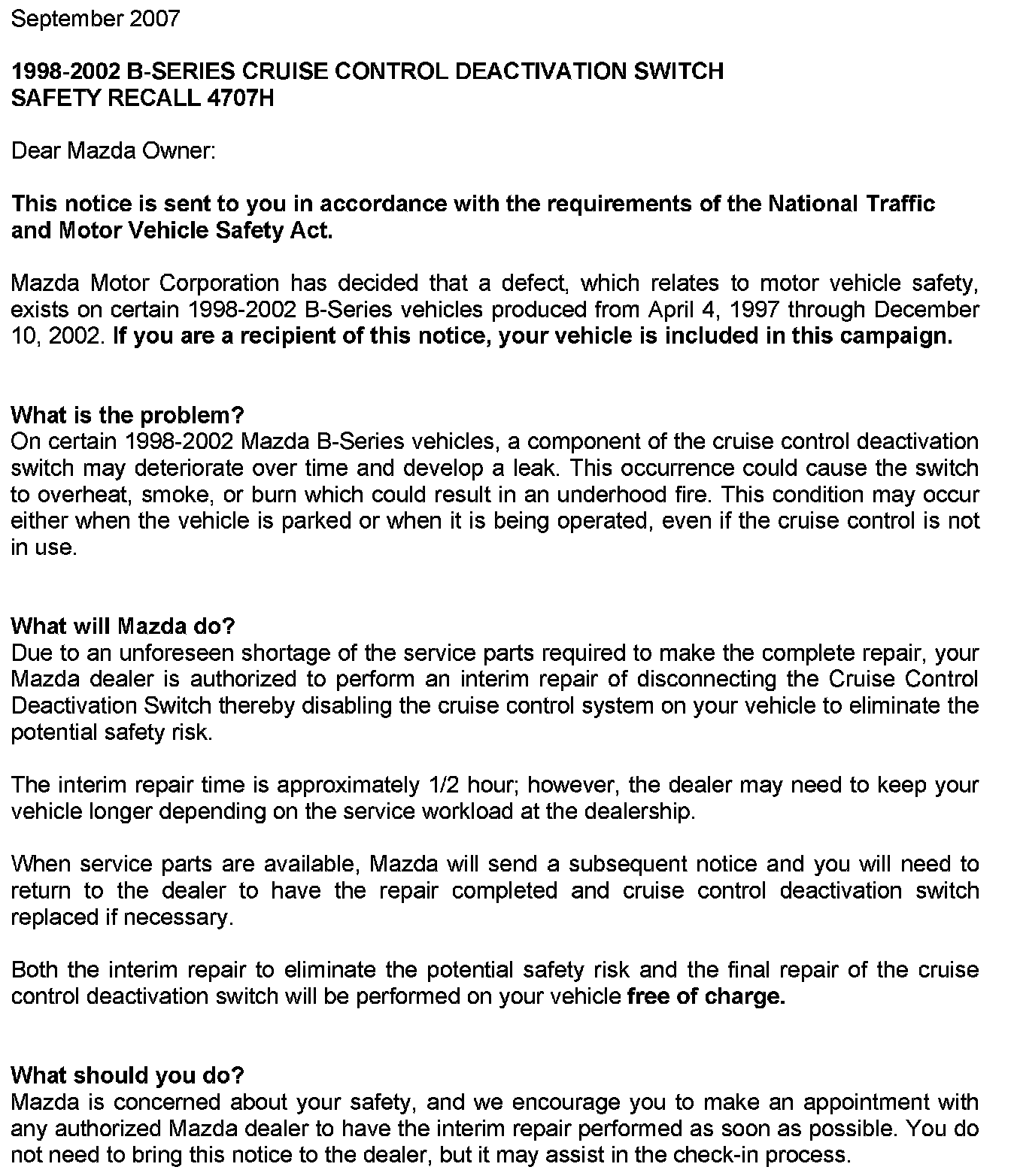 Recall - Cruise Control Deactivation Switch Fire Hazard
