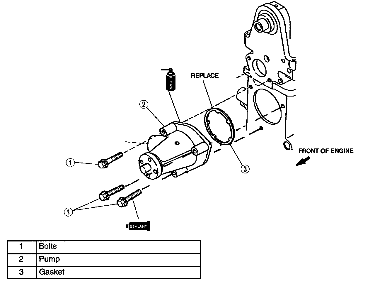 6. Apply grease to three locations on the water pump.