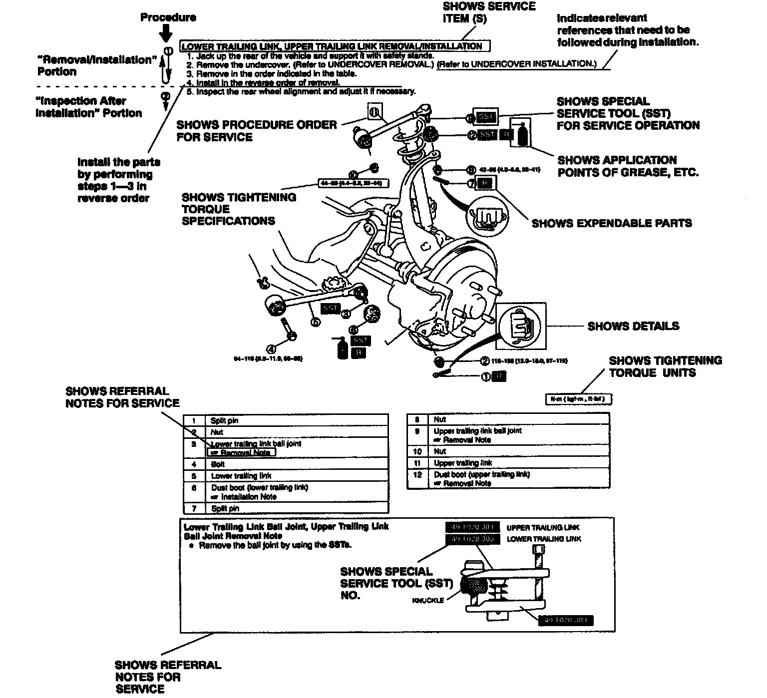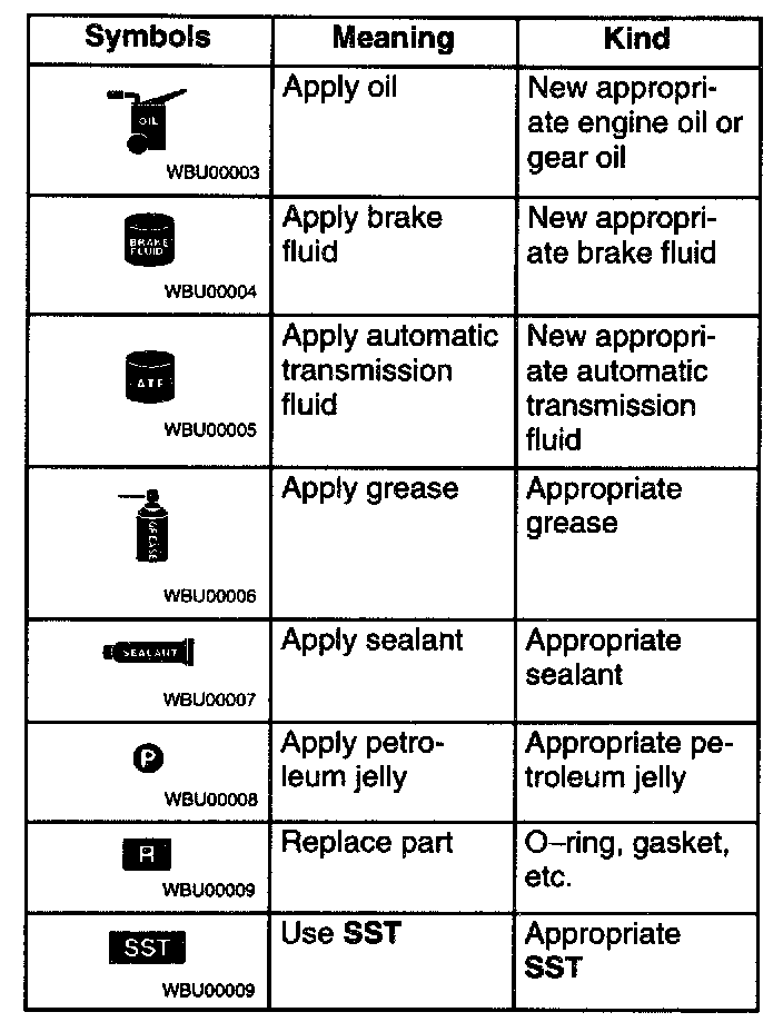 - There are eight symbols indicating oil, grease, fluids, sealant, and the use of SST or equivalent. These symbols show application points or use of these materials during service.
