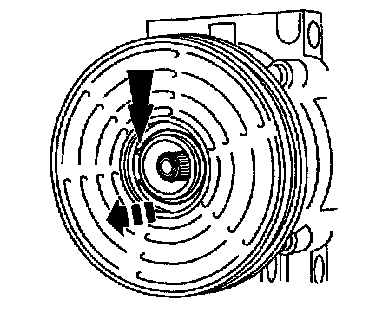 8. Measure and adjust the clutch air gap by removing or adding A/C clutch hub spacers; refer to MAGNETIC CLUTCH ADJUSTMENT.