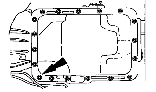 2. Remove all the oil pan bolts except for two in the front. Loosen the two bolts. Pry the rear of the oil pan down and allow fluid to drain. After fluid is drained remove the two remaining bolts.