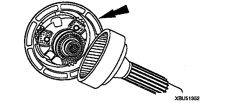 ^ Temporarily insert the overdrive planetary gear carrier assembly into the center shaft and front/overdrive one-way clutch assembly for verification of the one-way clutch.