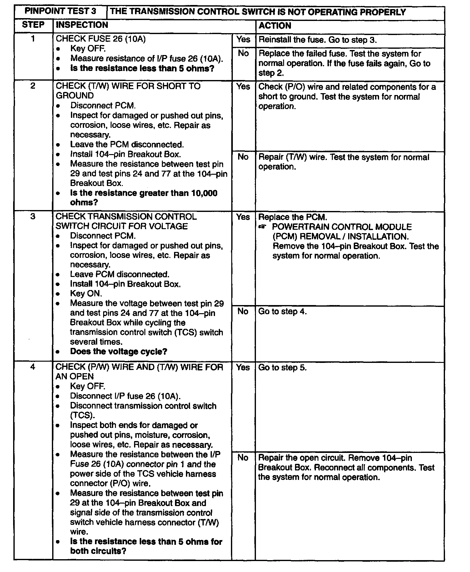 PINPOINT TEST 3: THE TRANSMISSION CONTROL SWITCH IS NOT OPERATING PROPERLY