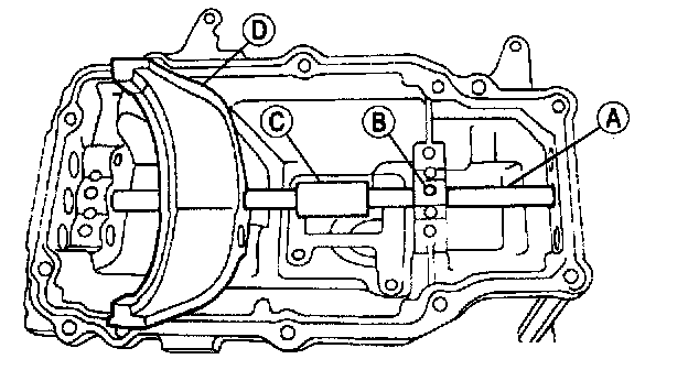 4. Position the (B) detent ball and spring, the (C) shift gate, the (D) shift fork and spring and install the (A) third/fourth shift rail.