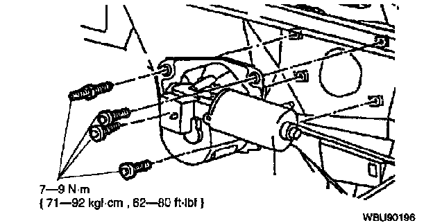 7. Remove the stud bolt and three bolts from the wiper motor.