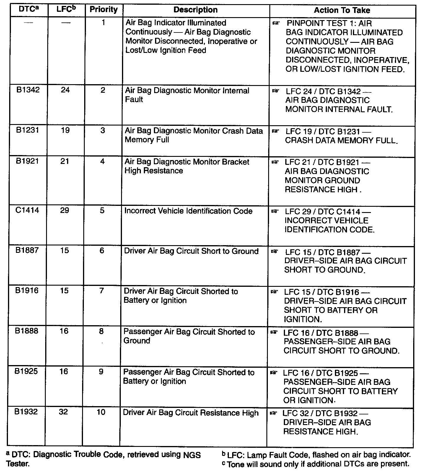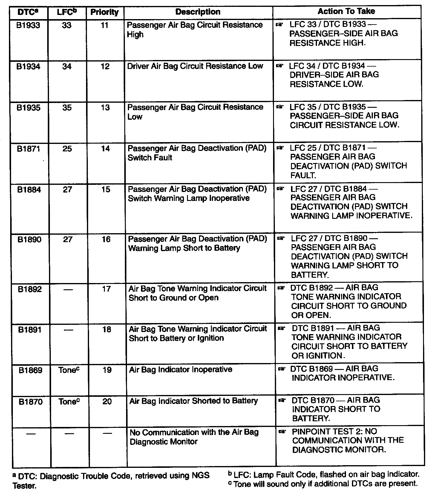 B Codes Indexed to AIr Bag Lamp Fault Codes