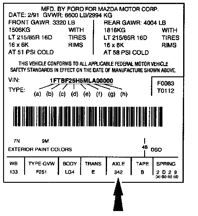 The vehicle certification (VC) label contains the manufacturer name, the month and year of manufacture, the certification statement, and the VIN. It also includes gross vehicle weight ratings (GVWR).