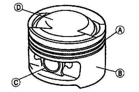 1. Clean and inspect the (A) ring lands, (B) skirts, (C) pin bosses, and the (D) top of the pistons. If wear marks or polishing are found on the piston skirt, check for a bent or twisted connecting rod.