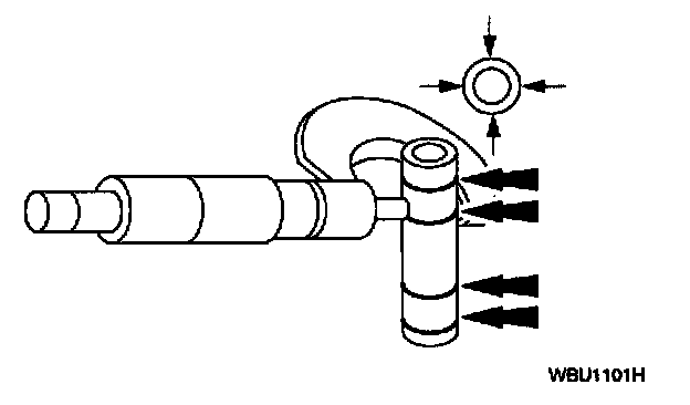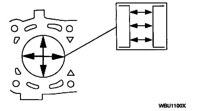 1. Measure the piston pin diameter in two directions at points shown. Verify the diameter is within specification.