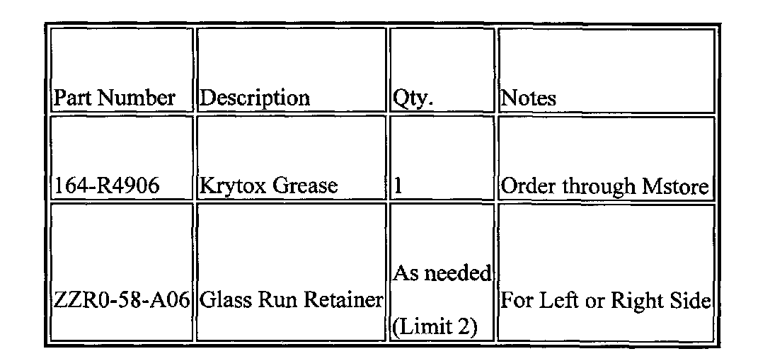 5. Apply a thin coating of service grease (Krytox) to the entire outer surface area of the door glass guide (glass run retainer).