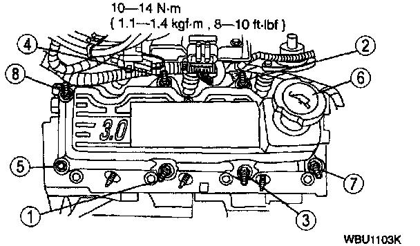 2. Tighten the five bolts and three stud bolts in the sequence shown.