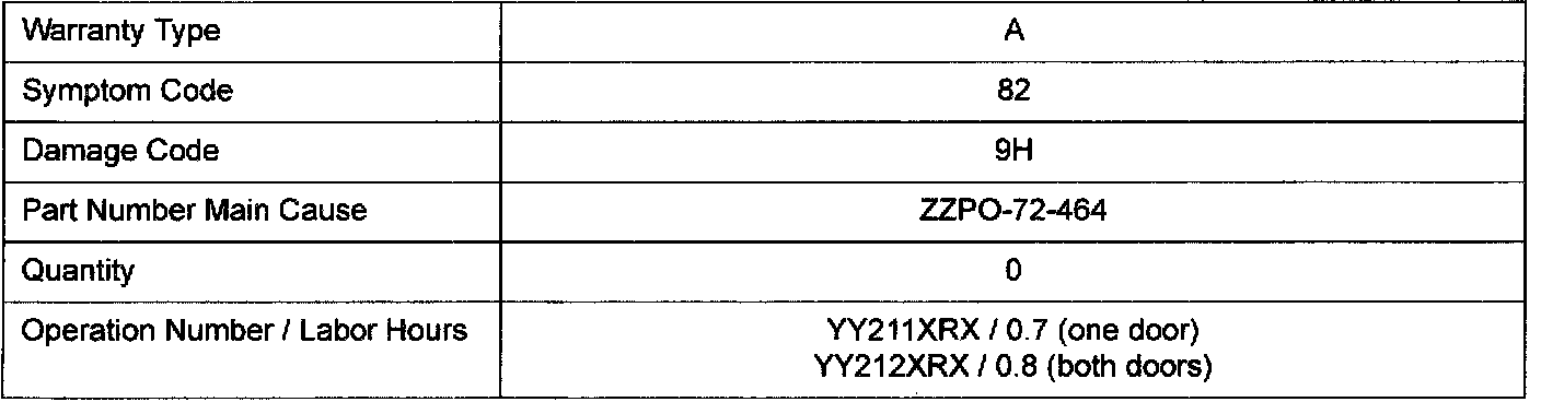 Some vehicles may exhibit a creaking, squeaking or tapping noise coming from the rear door(s) area while driving over bumps and/or during a hard turn while stopping. This may be caused by the rear door striker(s) being positioned incorrectly.