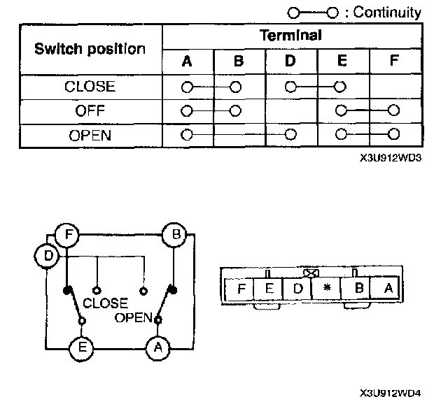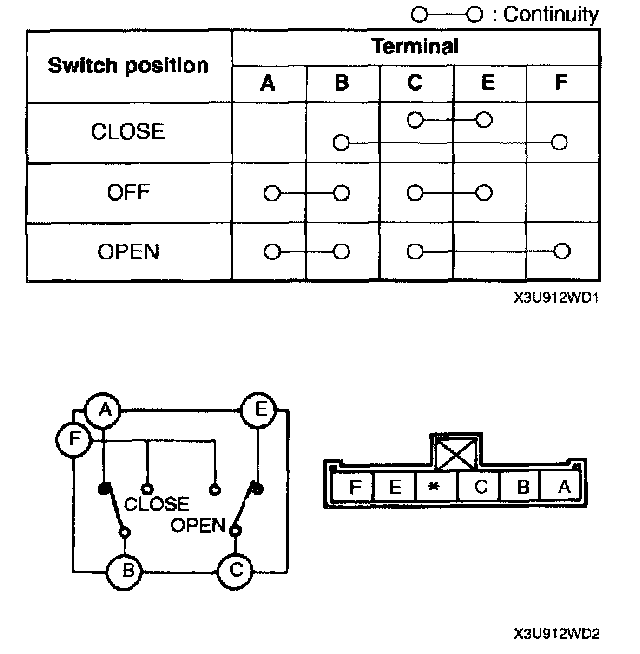 3. Inspect for continuity between the power window subswitch terminals using an ohmmeter.