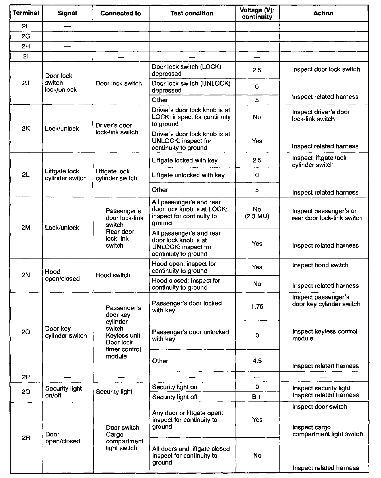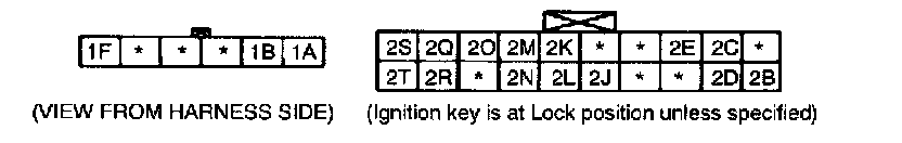 3. Disconnect the theft-deterrent control module connector before inspecting for continuity at terminals 1F, 2K, 2M, 2N, and 2R.