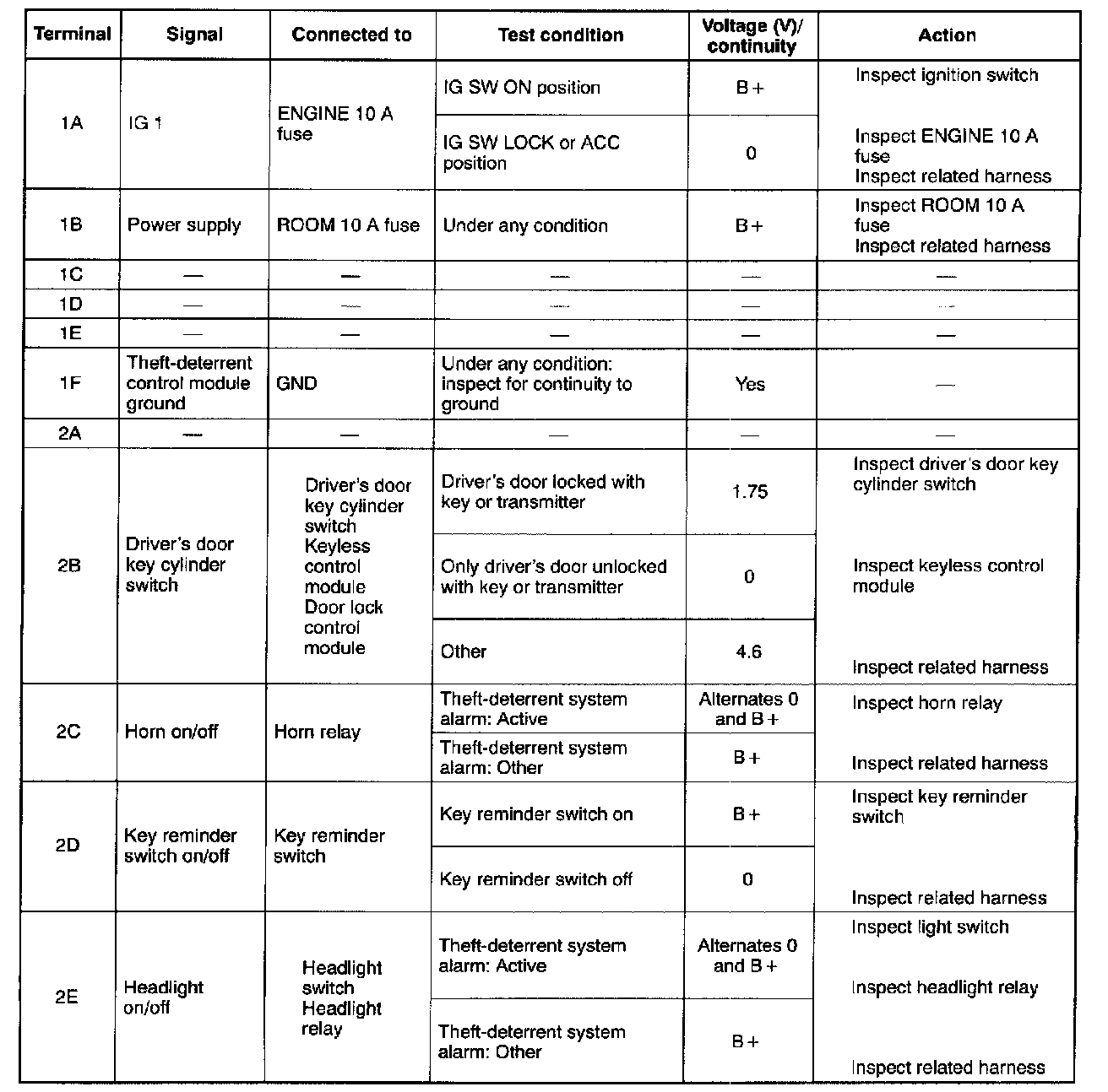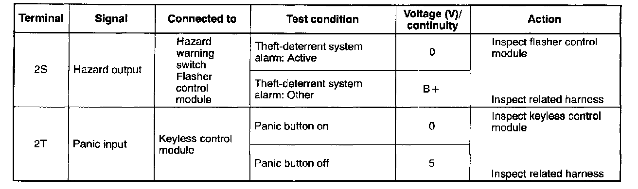 1. Remove the theft-deterrent control module from the bracket without disconnecting the connectors. (For easy access to the module)Terminal Voltage Table (Reference) - Connector View/Diagram: