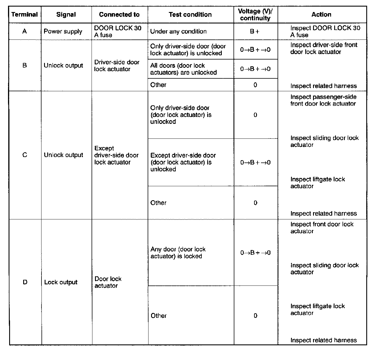 - If not as specified, inspect the parts listed under "Action" and the related wiring harnesses.