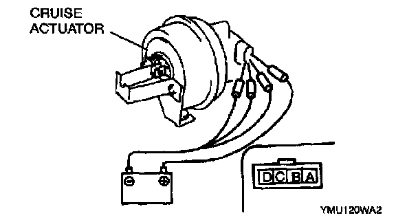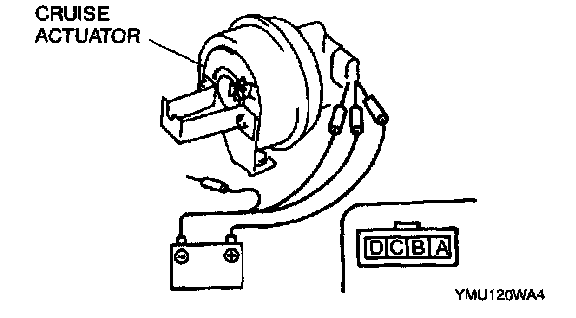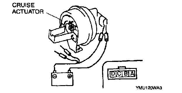4. Confirm that the diaphragm is drawn into the cruise actuator when battery positive voltage is connected to terminal B and terminals A, C, and D are connected to the ground.
