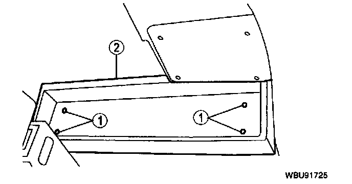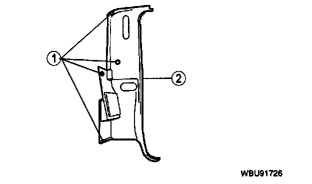 7. Remove the pushpins (1) and reposition B-pillar trim (2).