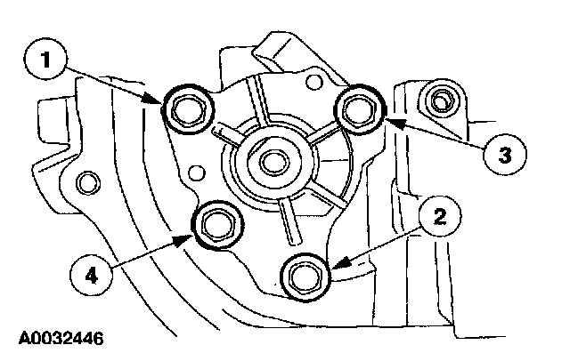 Install a new gasket and the oil pump assembly. Tighten the bolts in the sequence shown in two stages.