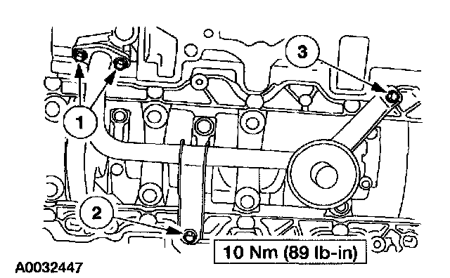 Install a new oil pump pickup tube gasket and the pickup tube. Tighten the bolts in the sequence shown.