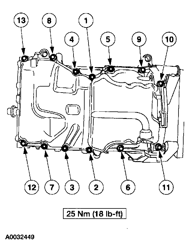 Install a new gasket and the oil pan. Tighten the bolts in the sequence shown.
