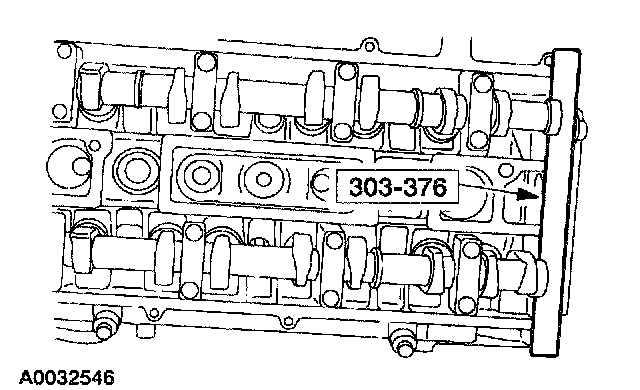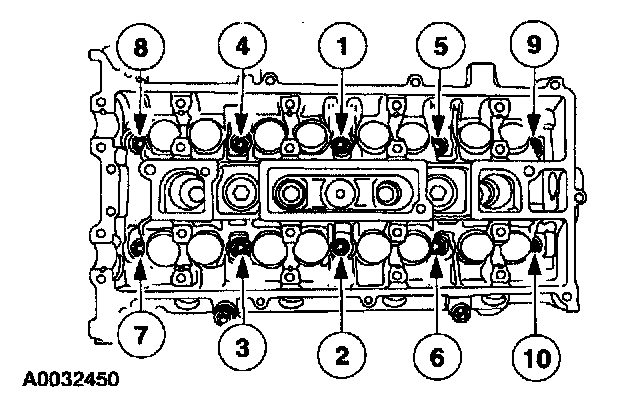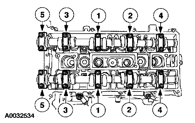 ^ Stage 1: Tighten the camshaft bearing caps one turn at a time until tight.