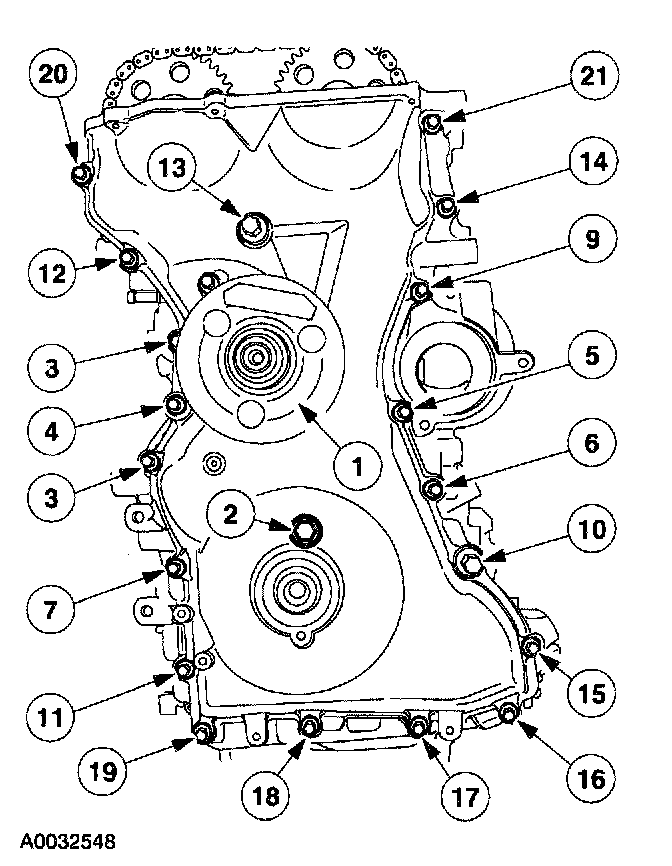 Install the front cover. Tighten the bolts in the sequence shown in three stages.