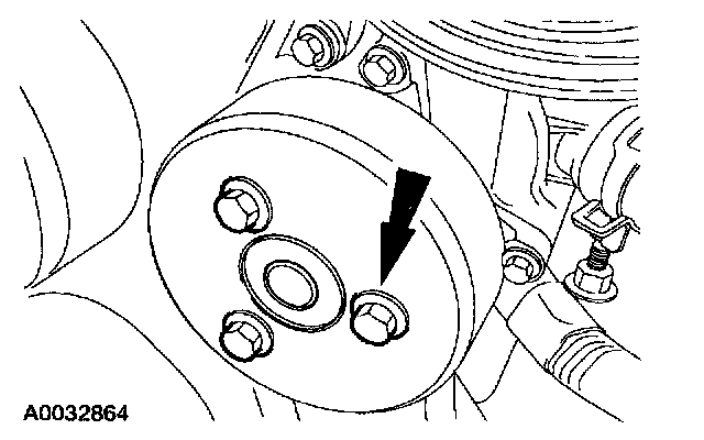 18. CAUTION: There is one bolt behind the cooling fan drive pulley. This bolt can be accessed by lining up one of the holes in the pulley with the bolt.