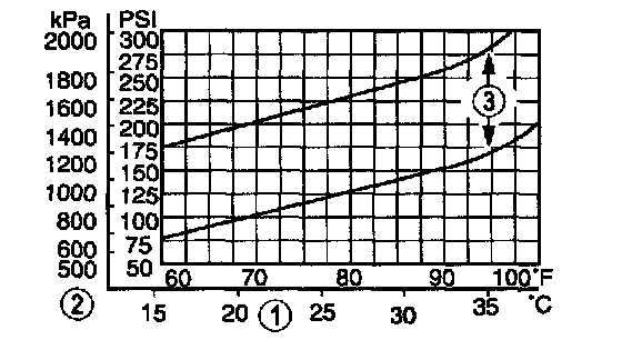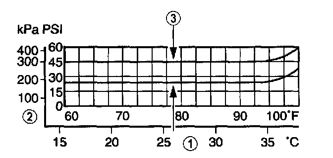 NOTE: In ambient temperatures between 38 °C - 43 °C (100 °F - 110 °F), the system performance pressures will be the same as those for ambient temperatures shown on the chart in the 32 °C - 38 °C (90 °F - 100 °F) range.