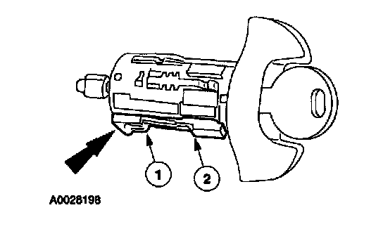 3. Remove the key warning switch by prying the clip (1) down and pushing the key warning switch (2) off the rear of the ignition lock cylinder.