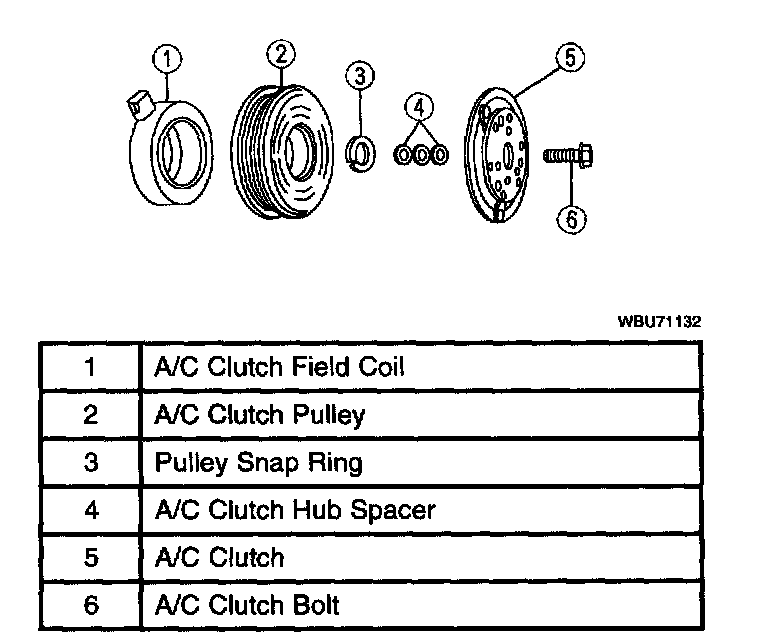 - When the battery positive voltage (B+) is applied to the A/C clutch field coil, the clutch plate and hub assembly is drawn toward the A/C clutch pulley.