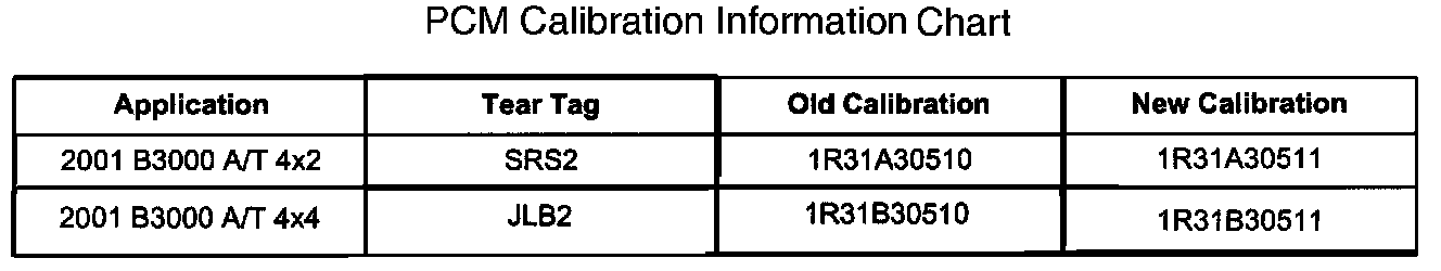 - If condition is still present or returns after repair, reprogram PCM to the latest level calibration using WDS V13 or later. (Refer to PCM Calibration chart shown).